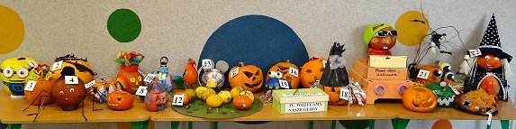 Wyniki konkursu ogłosiliśmy na tablicy w holu przedszkola. Gratulujemy wyróżnionym! Dziękujemy dużym i małym uczestnikom naszej zabawy. Wszystkie dynie były świetną dekoracją naszego przedszkola, szkoda tylko, że były takie nietrwale. Ich żywot utrwaliłyśmy na zdjęciach. Nagrody dla uczestników wręczone będą na grupowych spotkaniach jasełkowych. Wkrótce kolejny konkurs tym razem świąteczny. Zapraszamy do uczestnictwa!