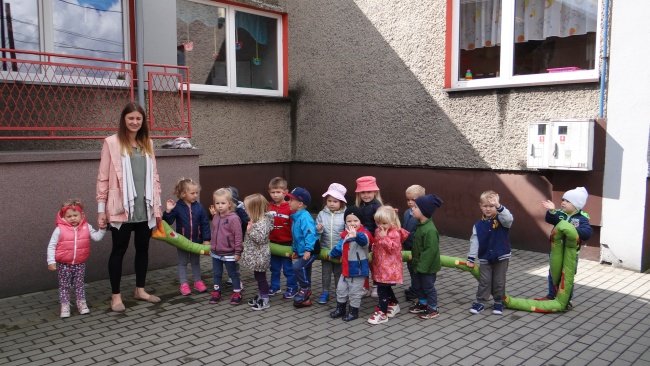 W tym dniu wybraliśmy się na nasz pierwszy spacer, podczas którego towarzyszył nam przyjaciel wąż. Nazwaliśmy go Kwiatuszek i będzie z nami wędrował podczas spacerów. Podczas pierwszego spaceru wędrowaliśmy na terenie przedszkola, żeby nauczyć się chodzić ładnie z wężem i móc wyruszyć w dalszy spacer w kolejnych dniach. Wędrowaliśmy dzielnie i niezwykle szybko.